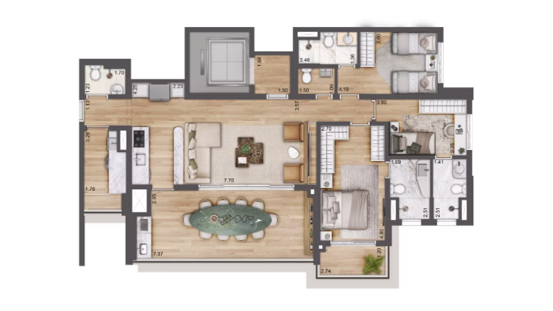 Além disso, cada unidade conta com hall social privativo e elevador exclusivo, garantindo discrição desde a chegada. As áreas sociais se integram de forma fluida, conectando sala, jantar e varanda em ambientes amplos e iluminados. Consequentemente, os espaços se tornam ideais para receber amigos ou desfrutar momentos em família.